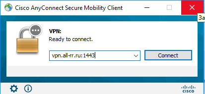 | 7. Вводим адрес сервера – vpn.all-rr.ru:1443, и нажимаем Connect. |