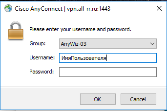 8. Выбираем группу AnyWiz-03, вводим логин и пароль. Нажимаем OK Если всё ввели правильно клиент подключится к сети. |