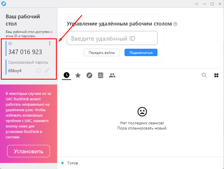 | В программе видим ID и Одноразовый пароль, которые необходимо сообщить нам на почту admin@lama.tomsk.ru |