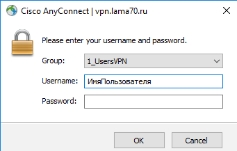 8. Выбираем группу 5_Aero_VPN, вводим логин и пароль. Нажимаем OK Если всё ввели правильно клиент подключится к сети. |